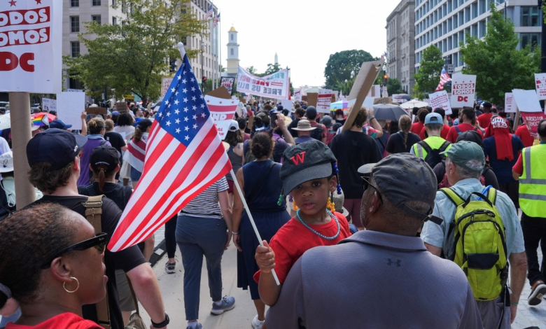 Participants in the “We Are All DC” march included undocumented immigrants and supporters of Palestine. Protesters shouted slogans criticising Trump and carried signs with messages such as “Trump must go now,” “Free DC,” and “Resist Tyranny.”