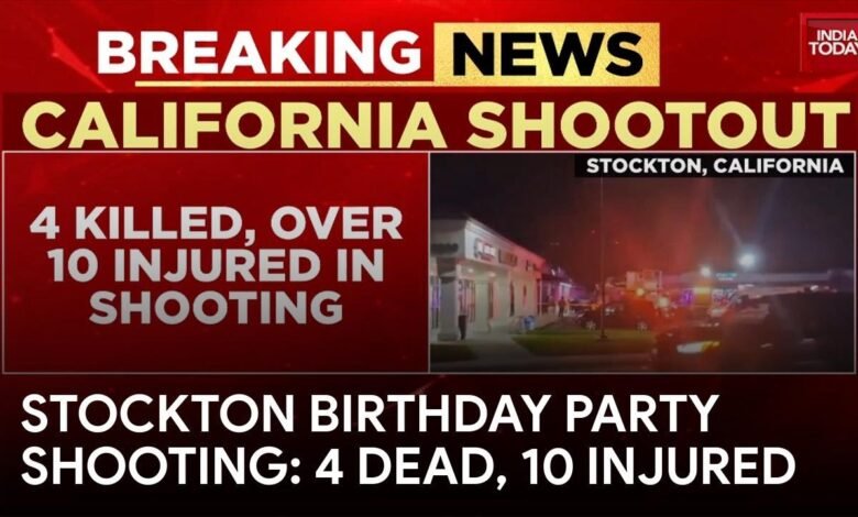 A mass shooting at a birthday party in Stockton, California, has left four people dead and over ten injured. The incident occurred on Saturday night at a banquet hall. Authorities report that the gunman opened fire on the crowd, including children, in what is described as an ‘unfathomable targeted attack’. The suspect remains at large, and the motive is currently unknown. Victims have been rushed to nearby hospitals, with the area remaining an active crime scene. The report highlights the growing concern over gun violence and mass shootings in the United States.