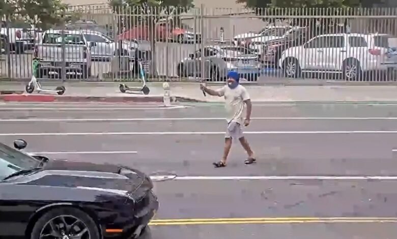 The bodycam footage released by the LAPD shows the Sikh man, wearing just a vest, shorts and a blue turban, wielding the sword in the middle of the road.