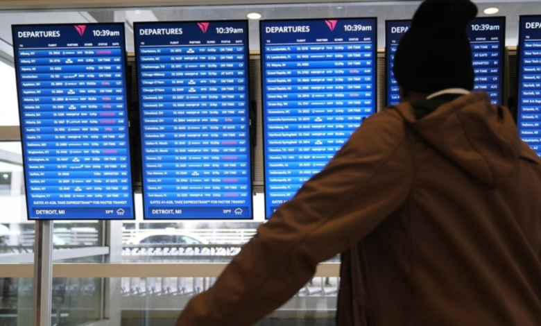 Detroit Metropolitan Wayne County Airport in Michigan was mostly empty Sunday morning, with minimal wait times at security checkpoints as delays and cancellations filled the departures and arrivals boards.