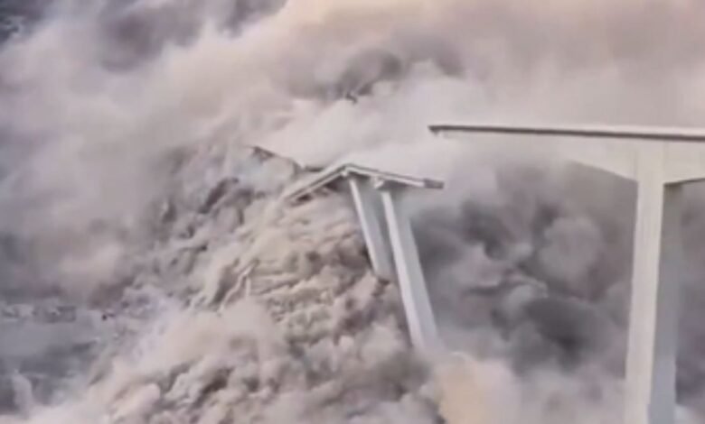The incident occurred near the Shuangjiangkou Hydropower Station in Maerkang city. Videos circulating on social media capture the hillside beginning to crumble, sending clouds of dust and debris skyward. Within seconds, the ground beneath the bridge gives way, causing its pillars to tilt and the span to collapse dramatically into the river.
